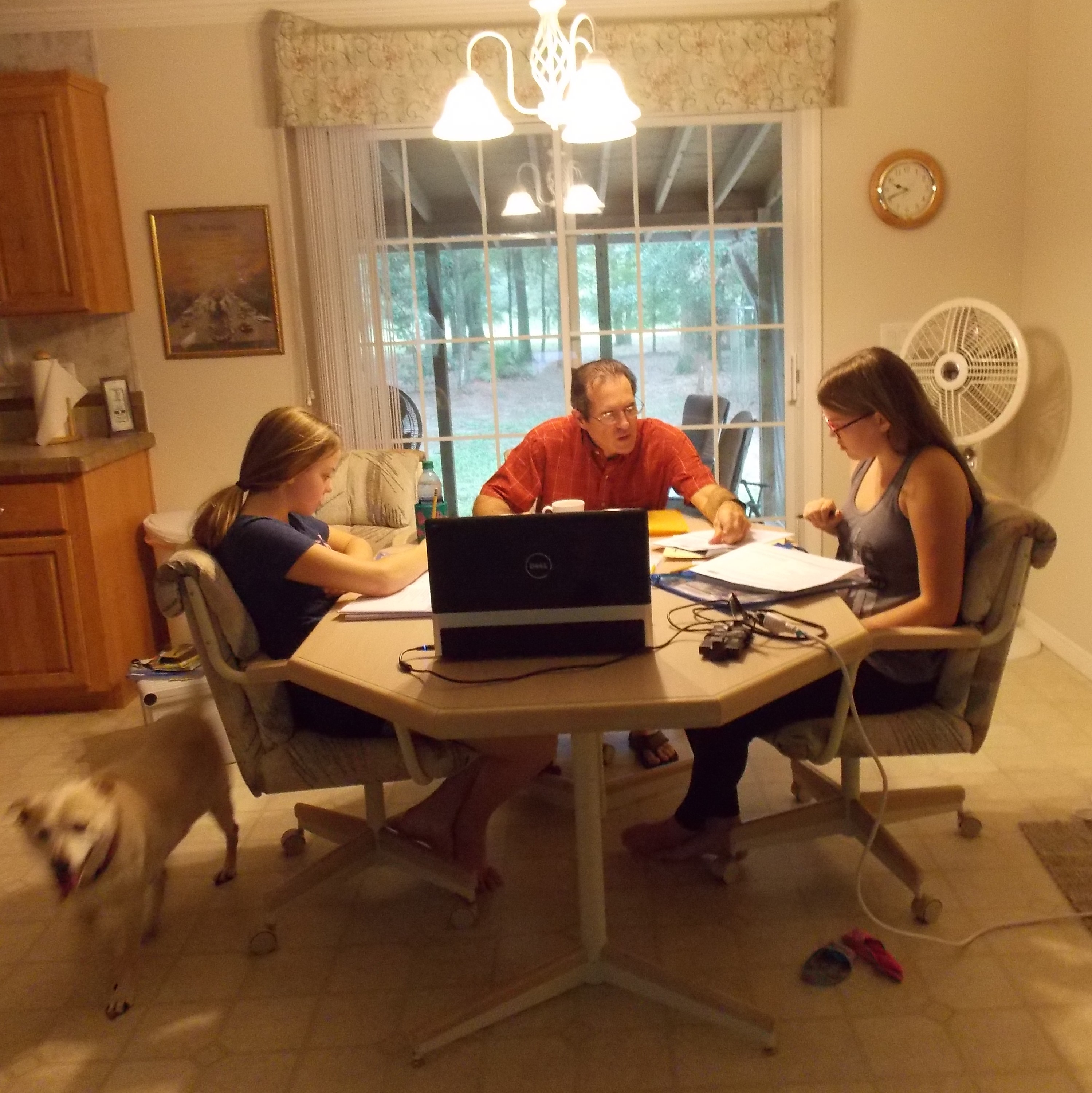 H&R SCUBA Classroom. Instructor Howard teaching these two teenage girls (sisters Kate & Reese) about Scuba Diving and how Awesome it will be to get in the water with Scuba Gear on. (Our dog Dottie in photo).