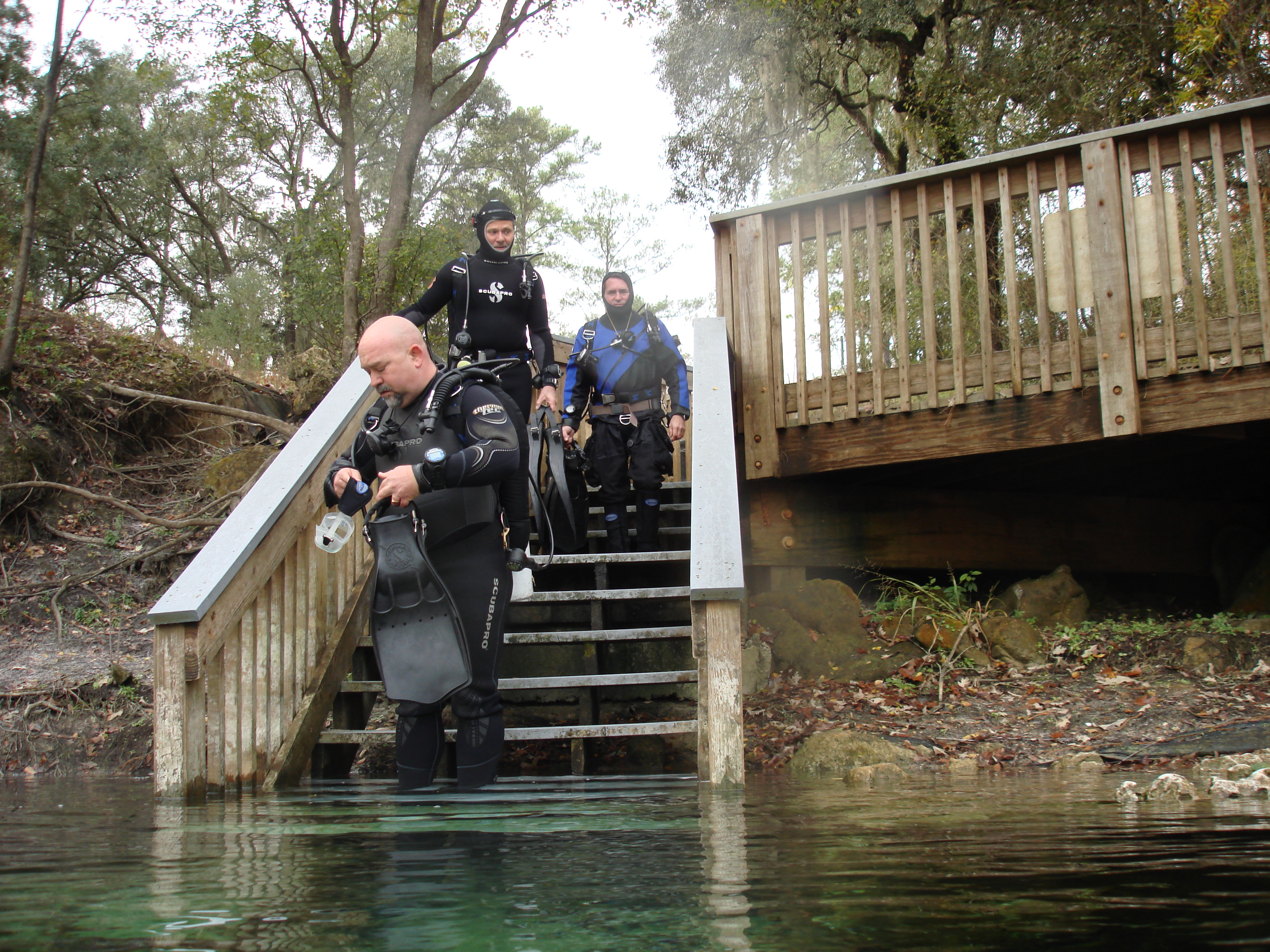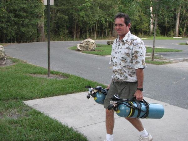 Little River Springs – Howard Posted on September 18, 2013 by H&R SCUBA Howard getting ready to Cave Dive at Little River Springs. He is carrying his two extra tanks to the water. The extra tanks are called Stage Tanks. (Photo by Rhonda Smith)