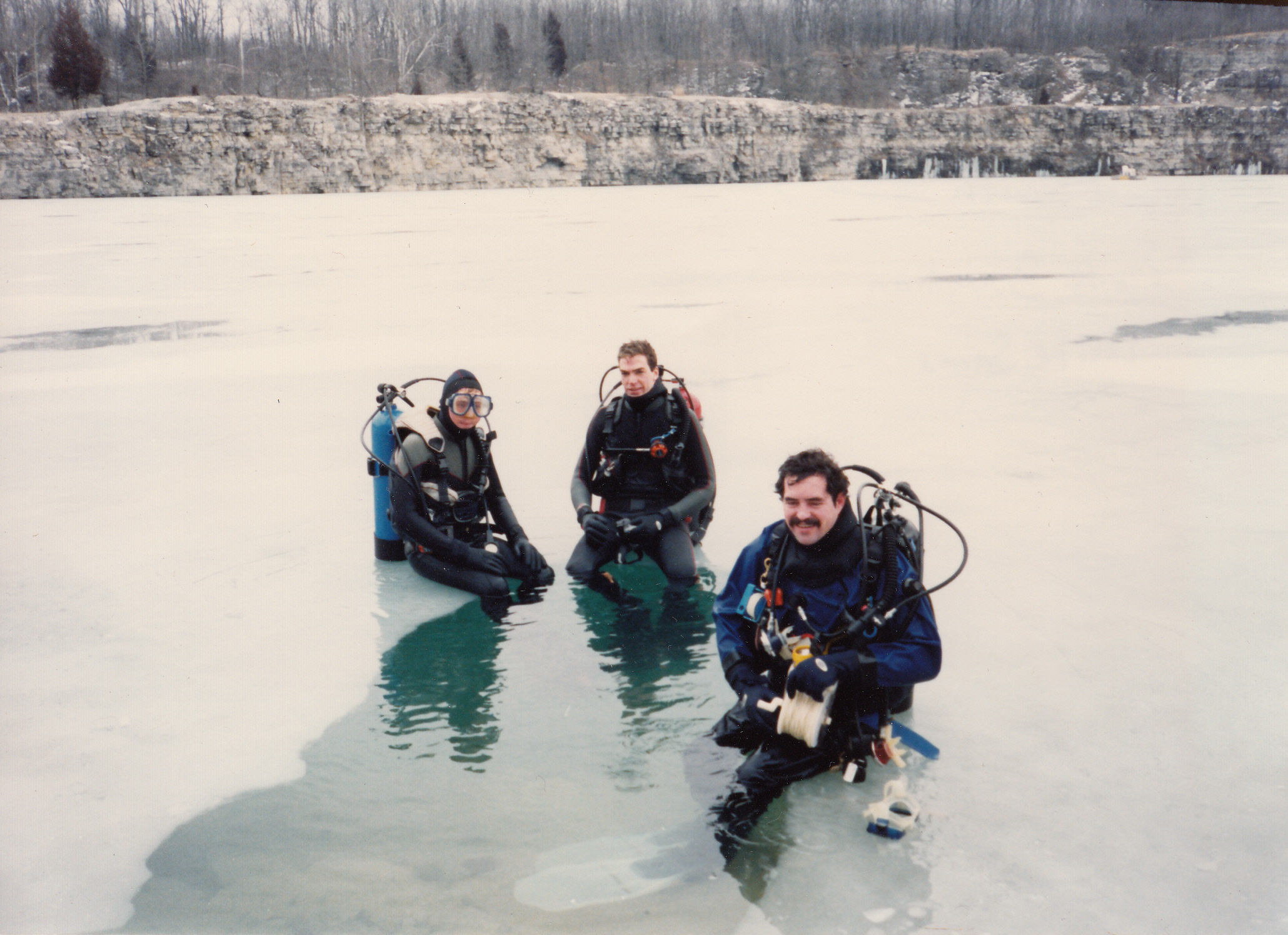 Howard Ice Diving with friends Posted on October 25, 2013 by H&R SCUBA Howard Ice Diving with friends in Indiana. Howard (front) Erik (middle) & Mike. Brrrrrrrrrrrrr! (Photo by Rhonda Smith)