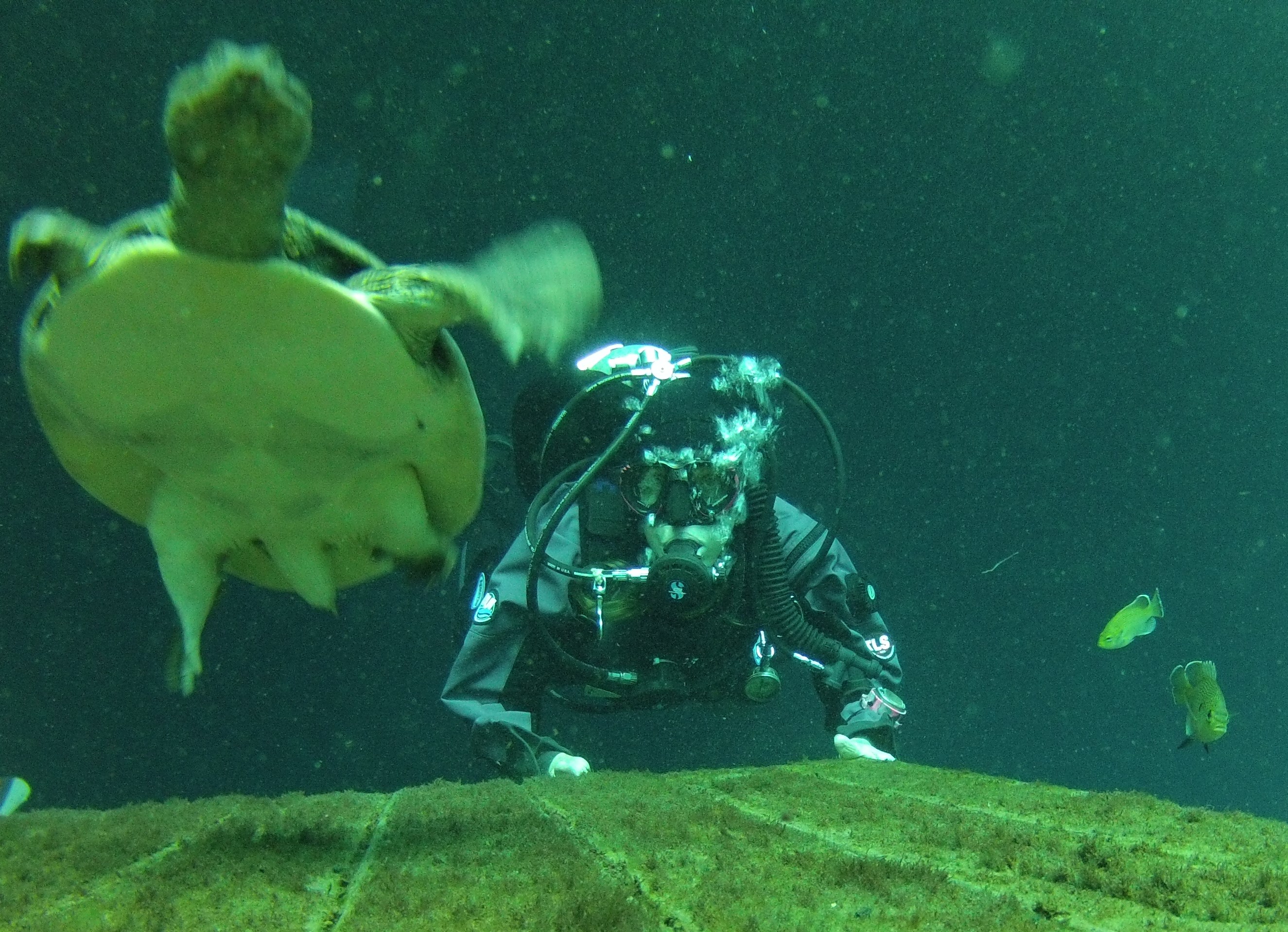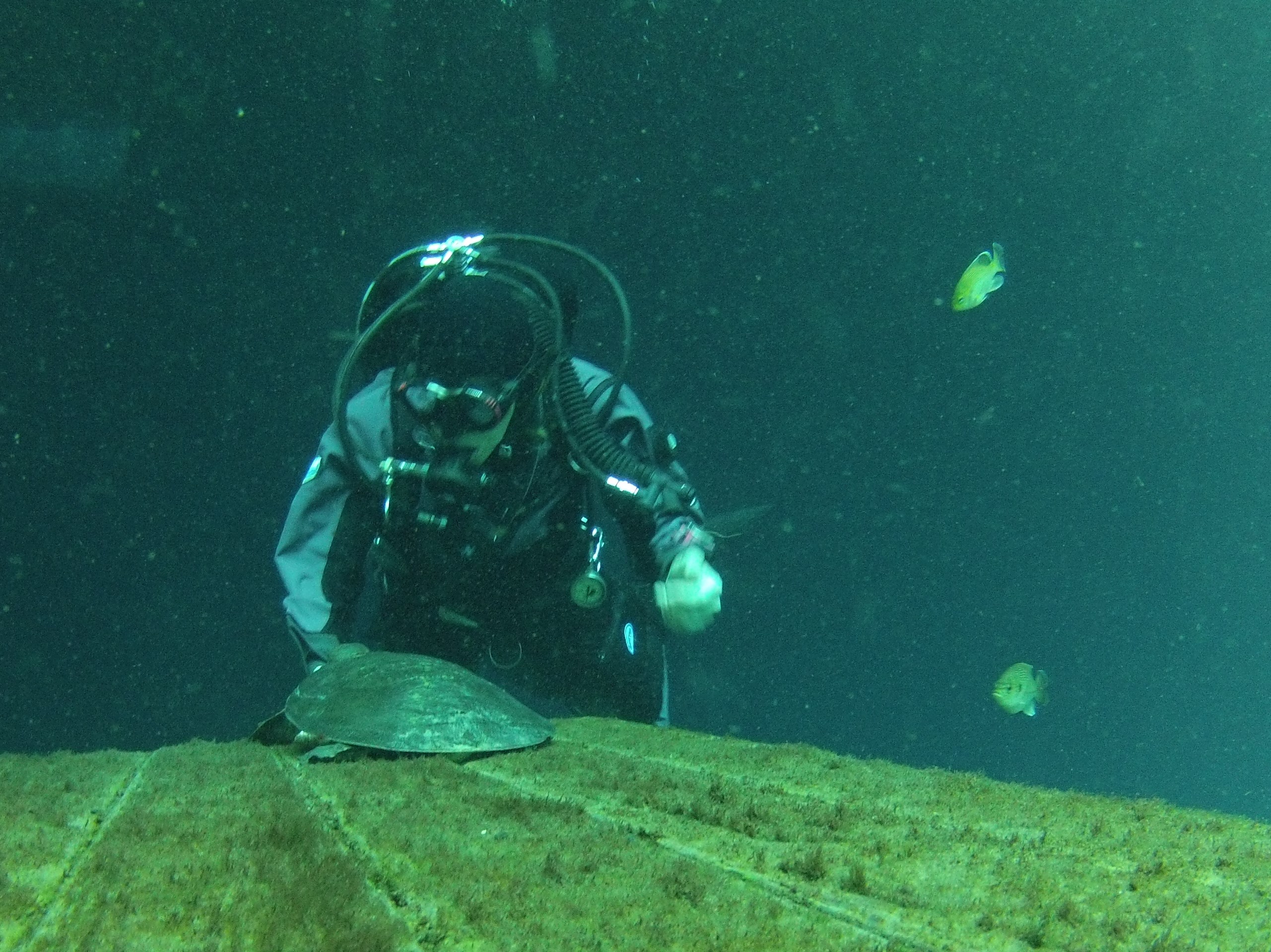 Halcyon Fun Dive-Blue Grotto Spring 8/5/2014 Posted on August 10, 2014 by H&R SCUBA Nicki spending time with Virgil the turtle while the two fish look on.