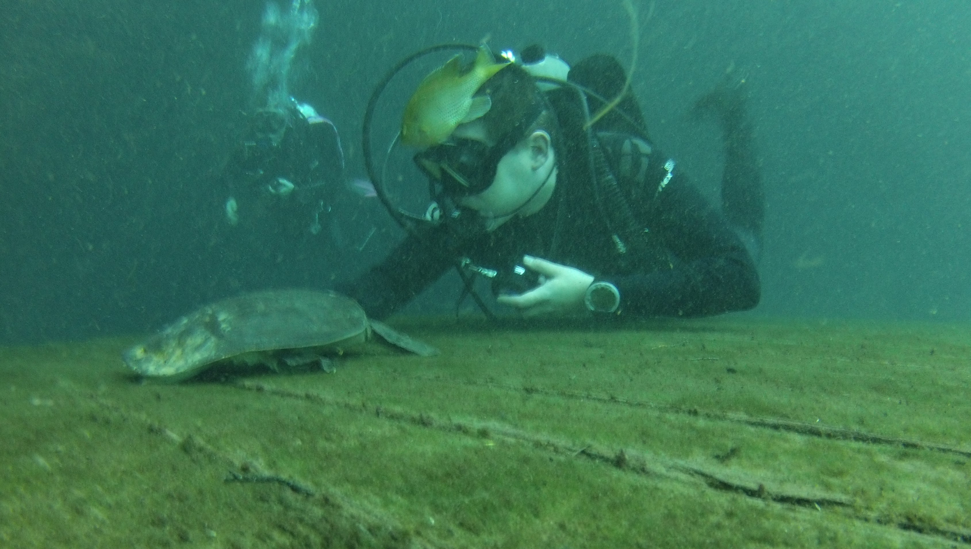 A friendly Turtle underwater at Blue Grotto Sink is well known by the Scuba Divers there. His name is “Virgil” and he likes to come over to the divers and say HI! 🙂